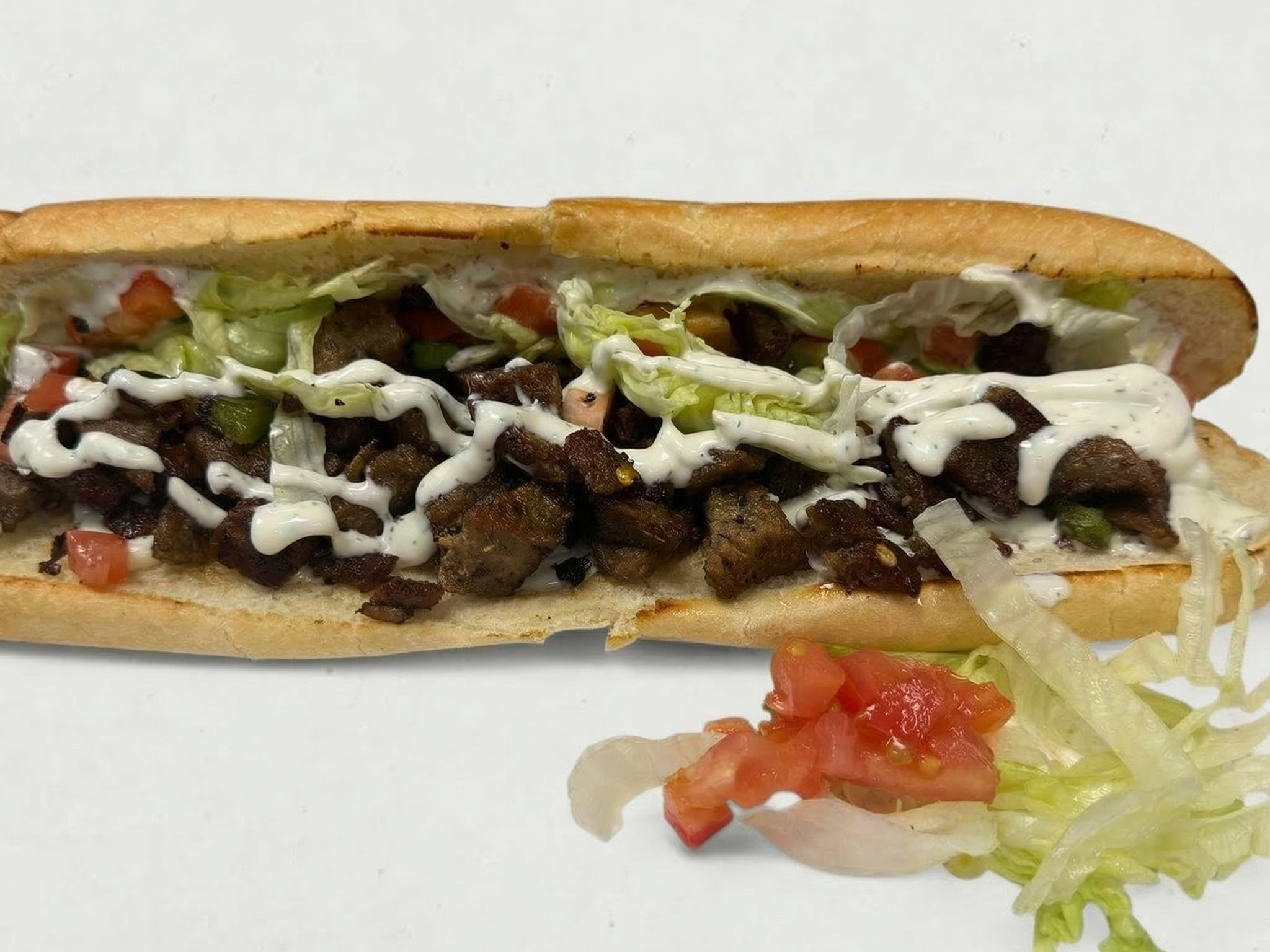 Slices of seasoned lamb, fresh lettuce, diced tomatoes, grilled red onions and green peppers, and creamy tzatziki sauce in a grinder.