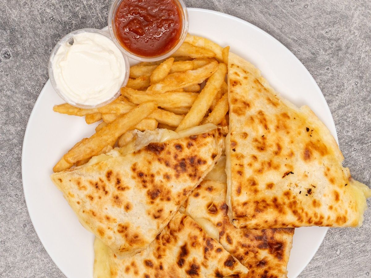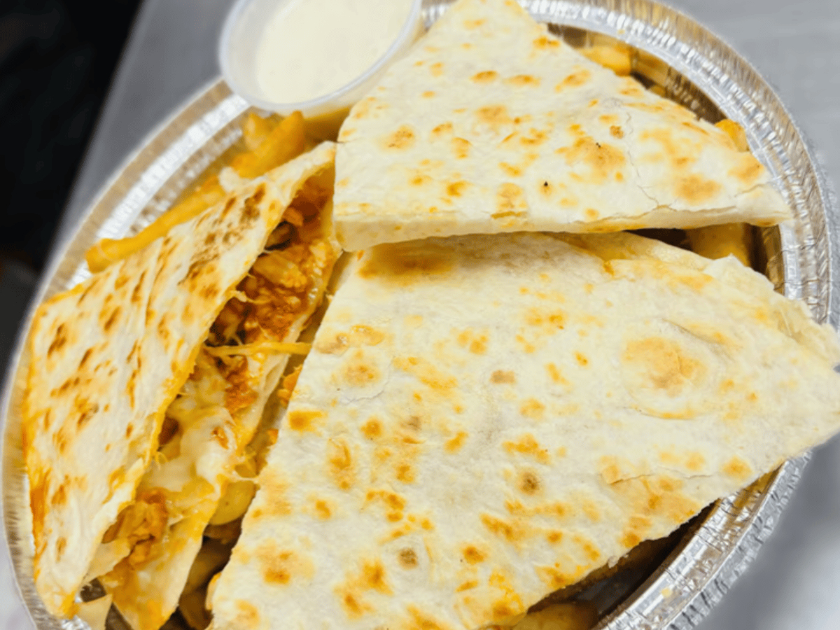 Grilled tortillas filled with melted cheese and served with a side of creamy dipping sauce.