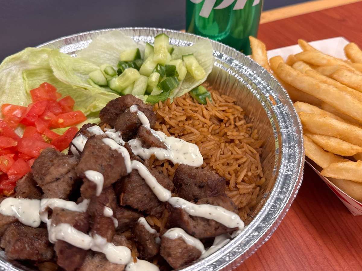 Savory lamb served over fragrant brown basmati rice, paired with lettuce, tomato, cucumber salad, and your choice of mild white sauce, spicy hot sauce, or tangy BBQ sauce. Add extra lamb for more protein. Served with fries and a drink