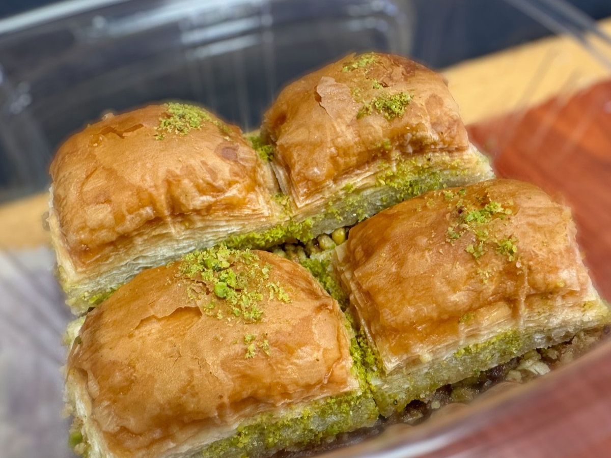 Layers of flaky pastry filled with chopped nuts and sweetened with syrup, topped with a sprinkle of ground pistachios. Four pieces per serving.