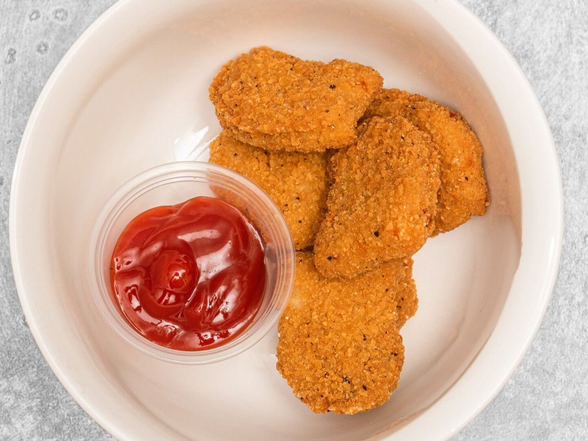 Golden, crispy chicken nuggets served with a side of ketchup.
