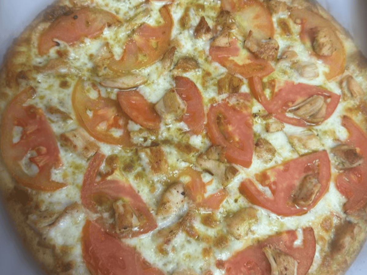 Grilled chicken, fresh tomatoes, pesto sauce, mozzarella
