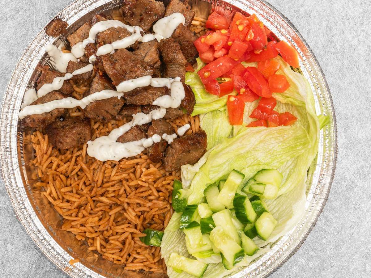 Savory lamb served over fragrant brown basmati rice, paired with lettuce, tomato, cucumber salad and your choice of mild white sauce, spicy hot sauce, or tangy BBQ sauce. Add extra lamb for more protein.