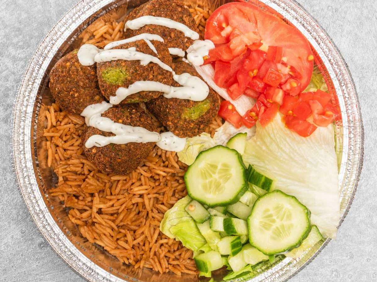 Falafel Over Rice 91% (37) Tender falafel over fragrant brown basmati rice with lettuce, tomato, cucumber salad and choice of mild white, spicy hot, or tangy BBQ sauce. Add extra falafel for more protein.