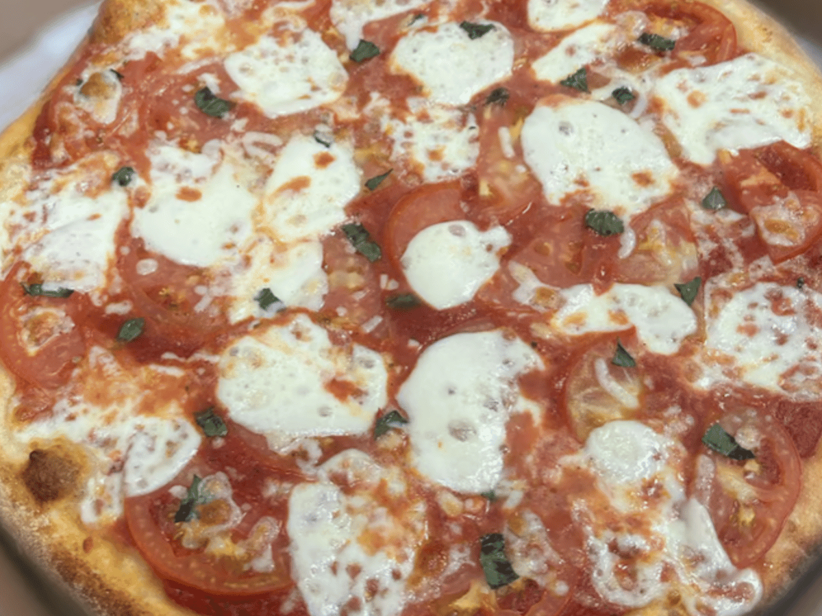 A classic Margherita with fresh tomatoes, mozzarella, and basil toppings over a tomato sauce base.