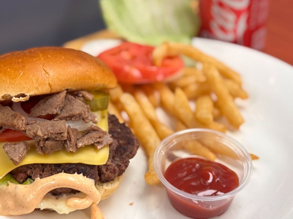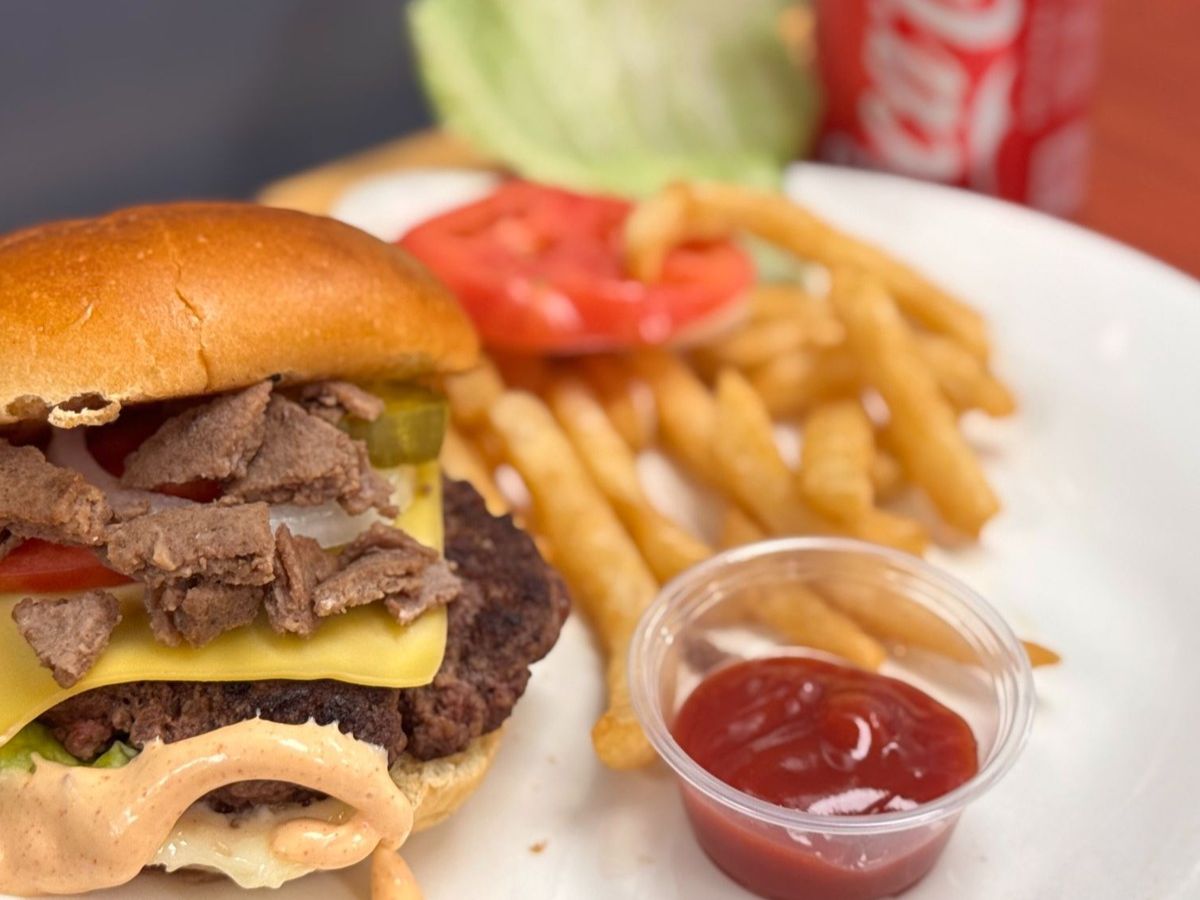 Kebabish sauce, beef patty, cheese, pickles, onions, jalapeño, tomato, lettuce, and steak accompanied by fries and a choice of drink including soda or bottled water.