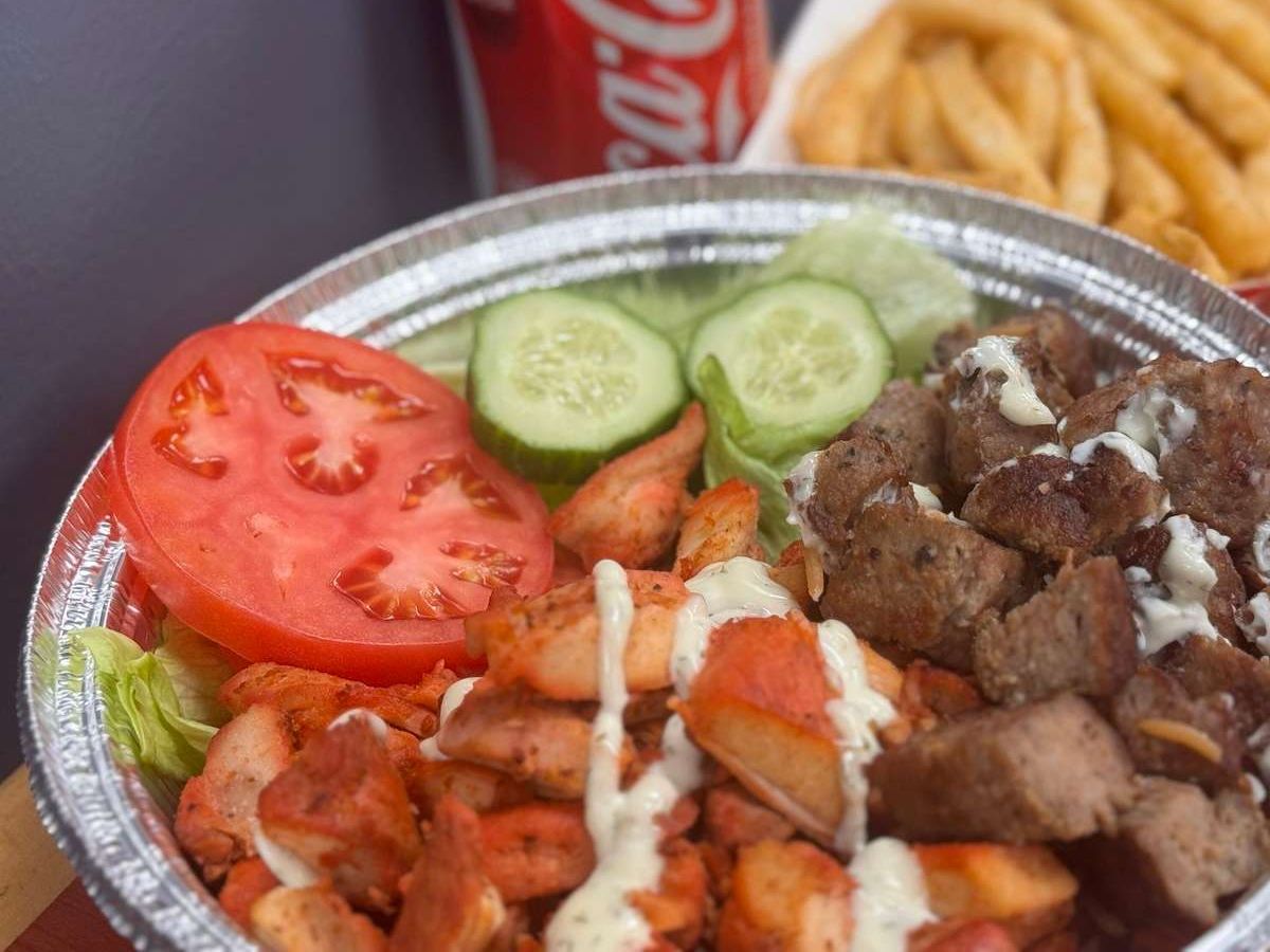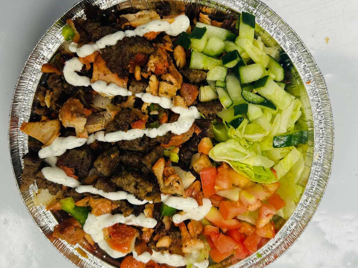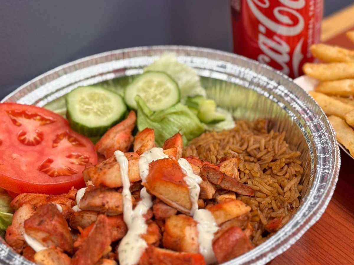 Chicken and lamb combo over fluffy brown basmati rice, with fresh salad. Customize with protein and top it off with your choice of mild white sauce, spicy hot sauce, or BBQ. Served with fries and a drink