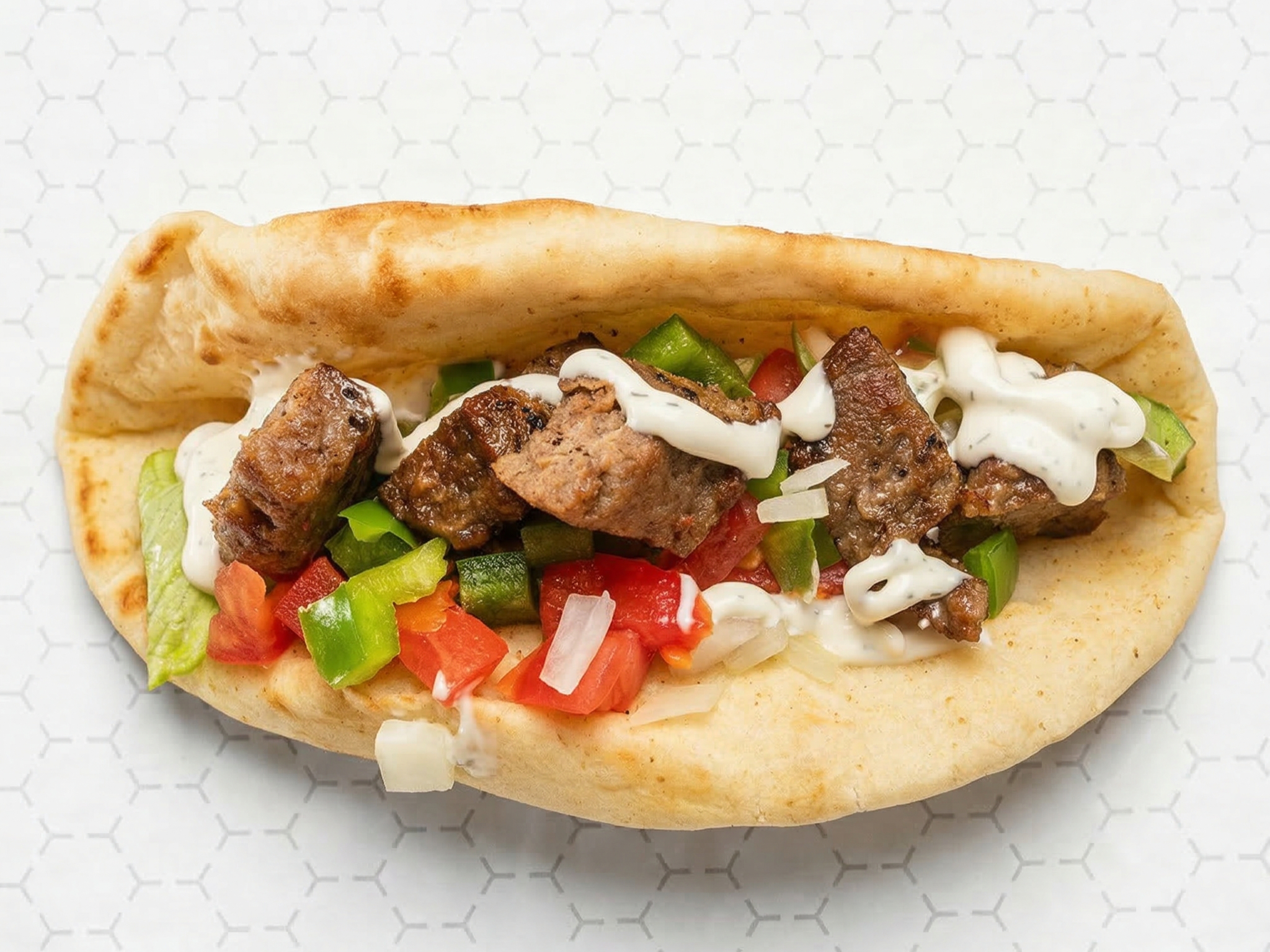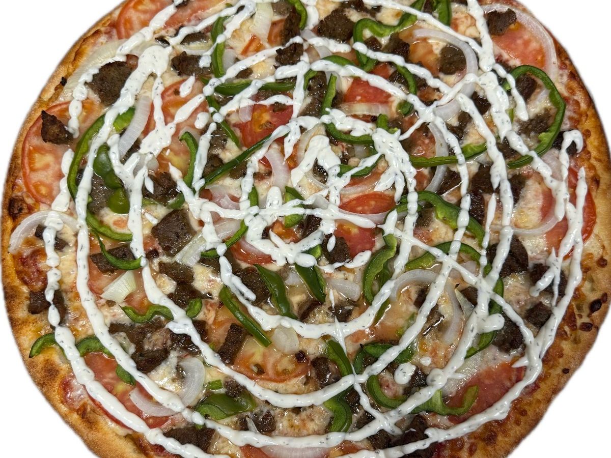 Seasoned lamb, tomatoes, onions, Green peppers, and tangy tzatziki sauce.