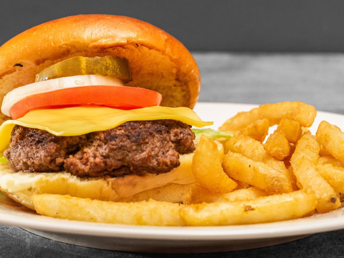 Burger with cheese, lettuce, pickles, and onions. Comes with fries and a drink option