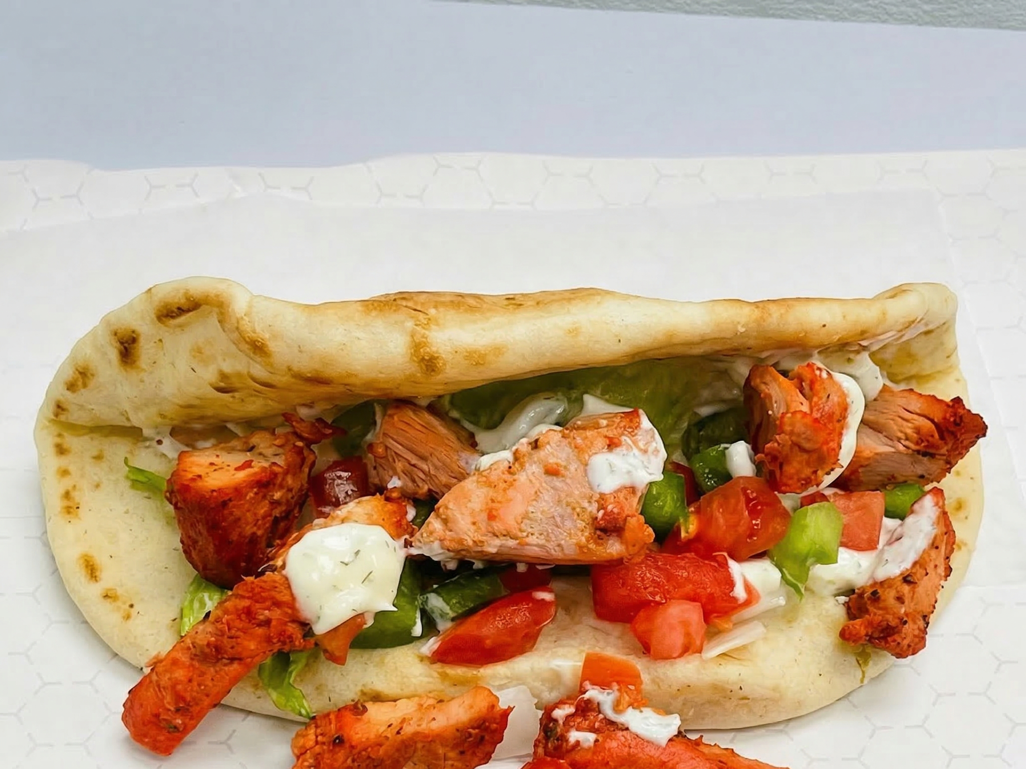 Tender grilled chicken on warm pita, topped with lettuce, tomato, cucumber salad. Customize with mild white sauce, spicy hot sauce, tangy BBQ sauce, or without white sauce. Flavorful and satisfying.