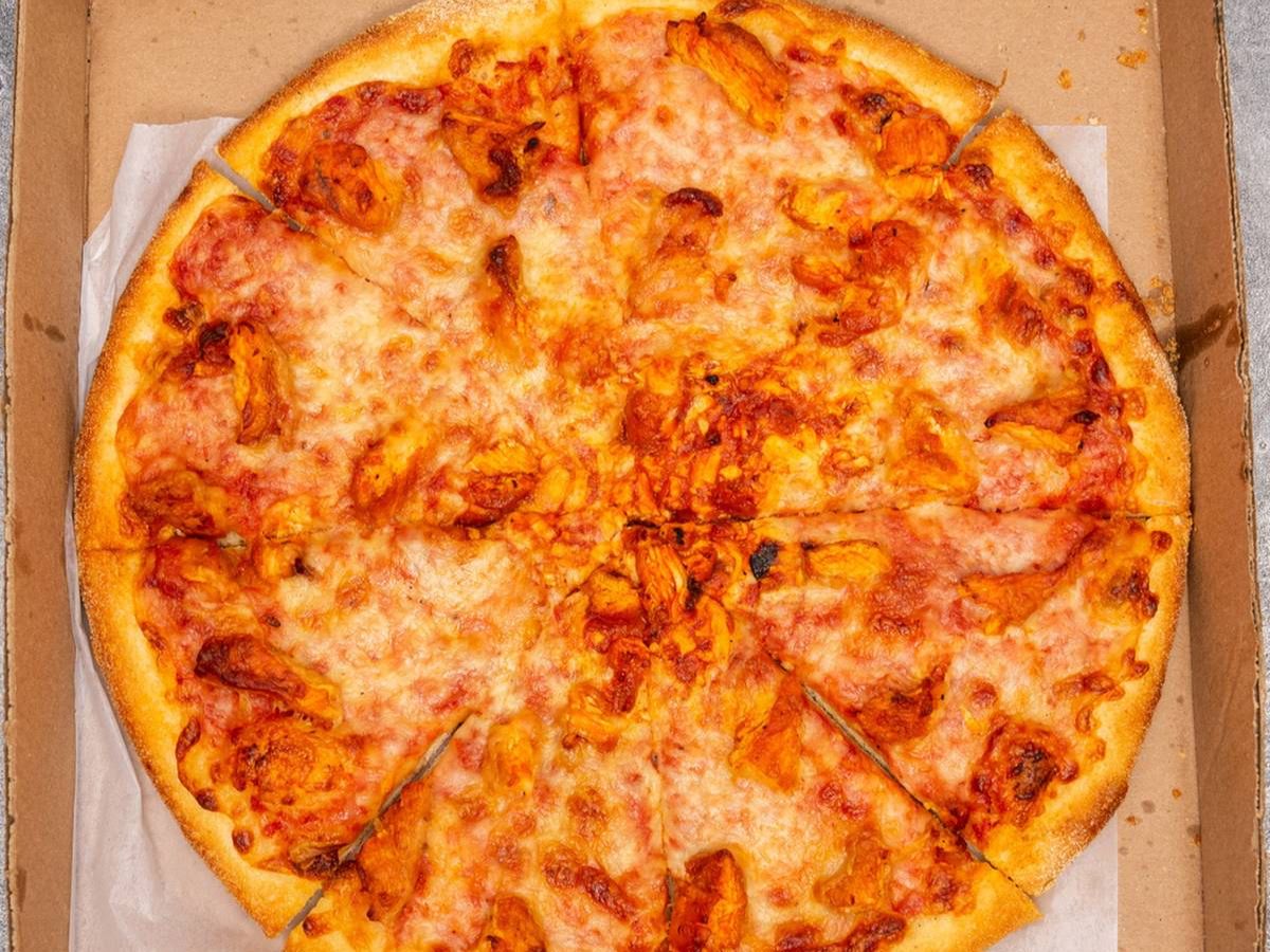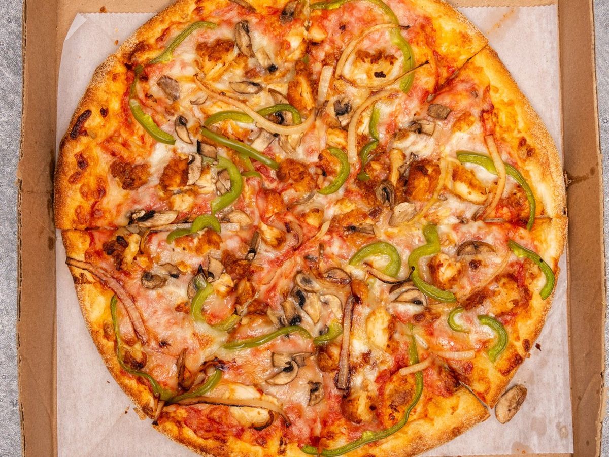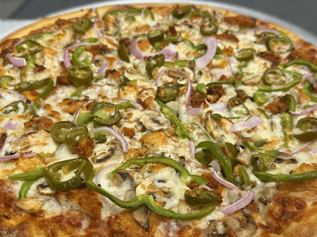 Mozzarella cheese, tomato sauce, spicy seasoned chicken tenders, red onions, green peppers, jalapeñosand sliced mushrooms.