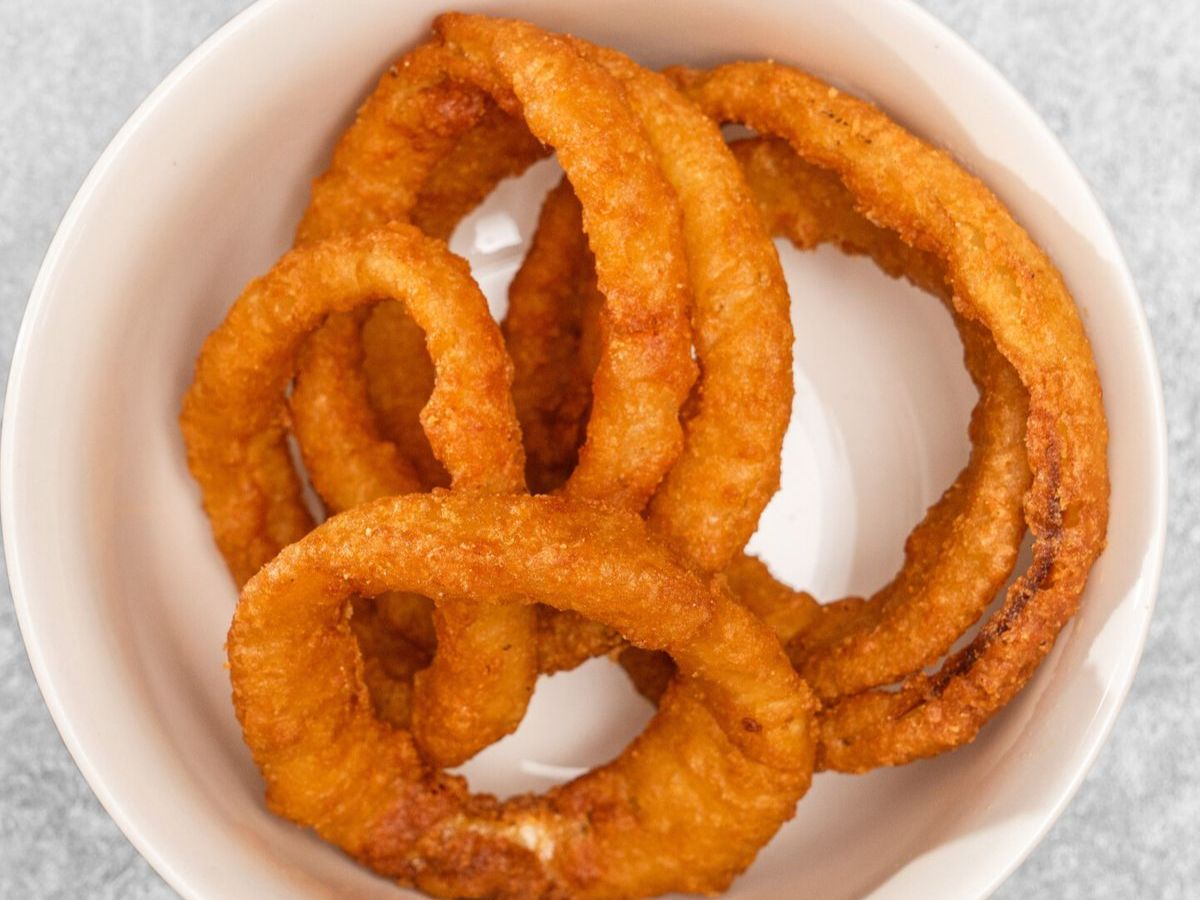 Crispy golden-fried onion rings, perfectly seasoned for a savory crunch.