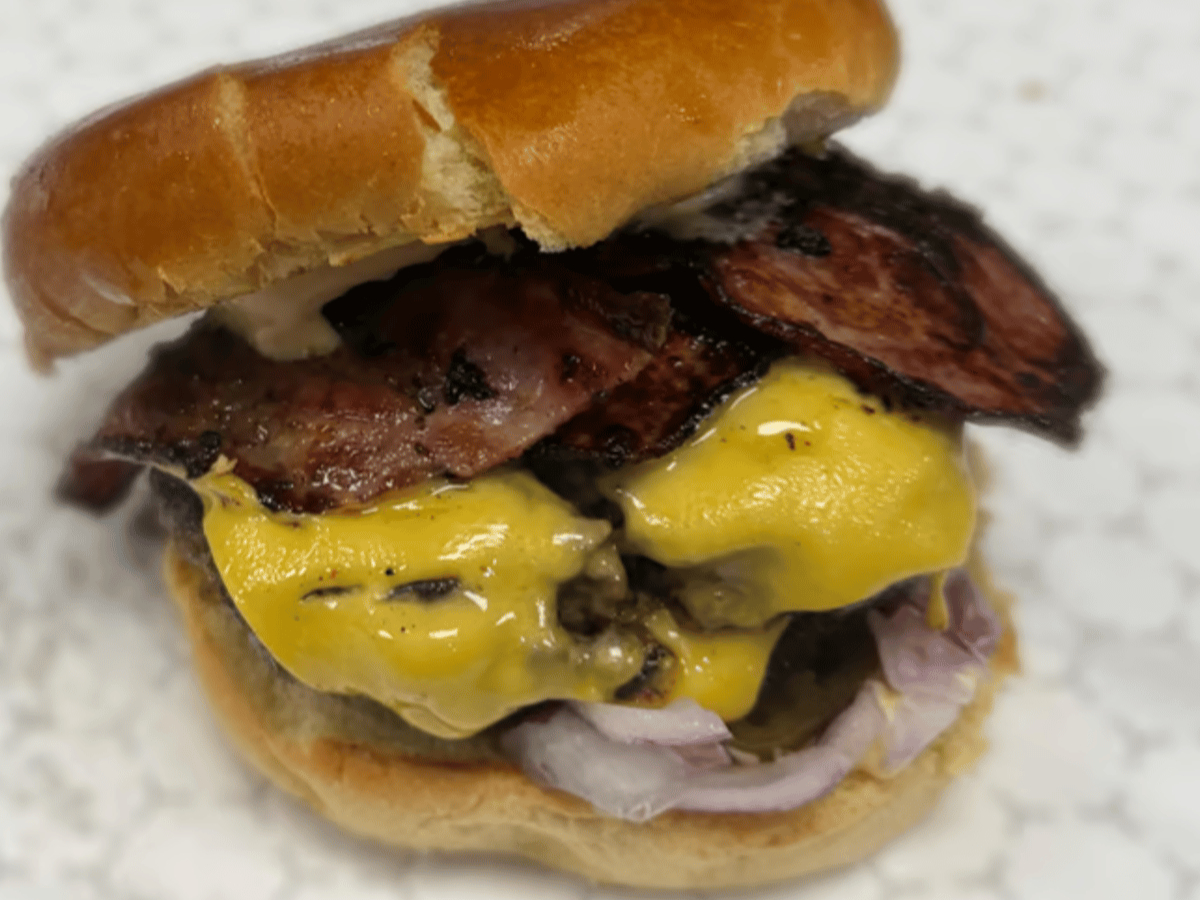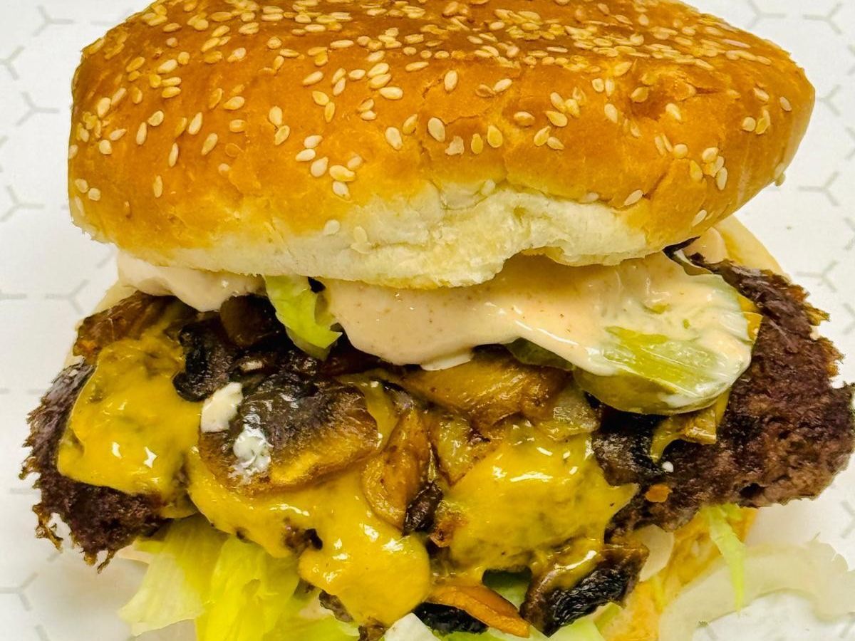 Kebabish sauce, beef patty, cheese, pickles, onions, jalapeño, tomato, lettuce, and halal Bacon Beef)