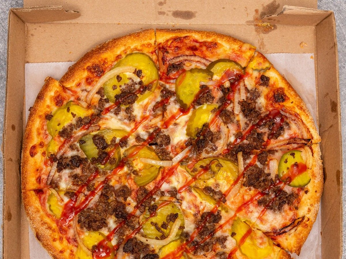A blend of seasoned ground beef, cheddar cheese, pickles, onions, and a ketchup drizzle on a pizza crust.