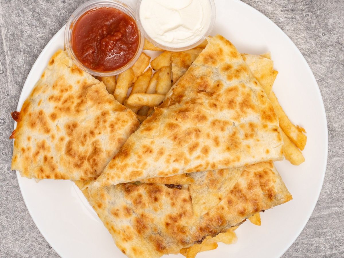 Grilled tortillas filled with tender steak, melted cheese, and caramelized onions, served with a creamy dipping sauce.