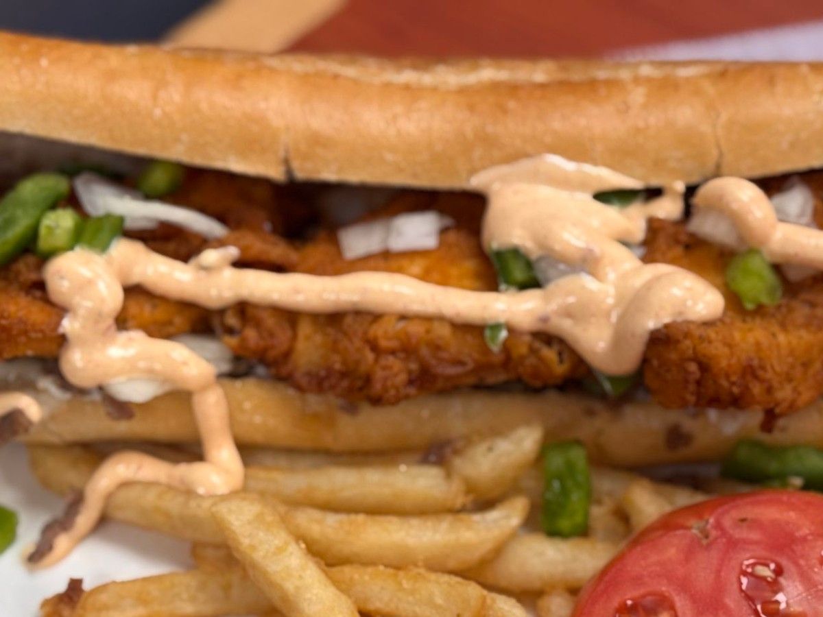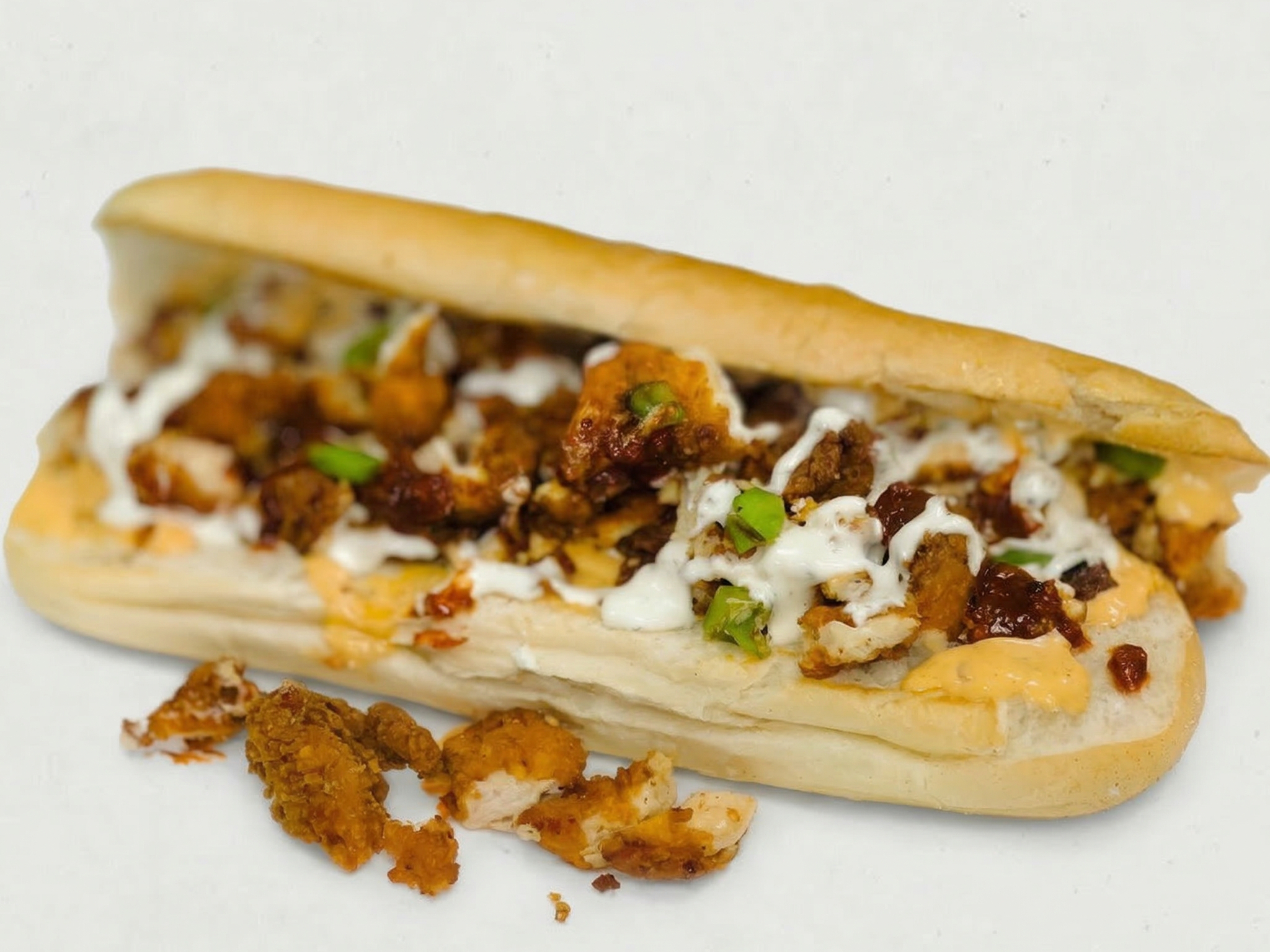Served on Fresh Italian bread with Chopped Crispy chicken Tenders , Fresh Grilled onions & Green peppers, Kebabish Sauce, white sauce & hot sauce