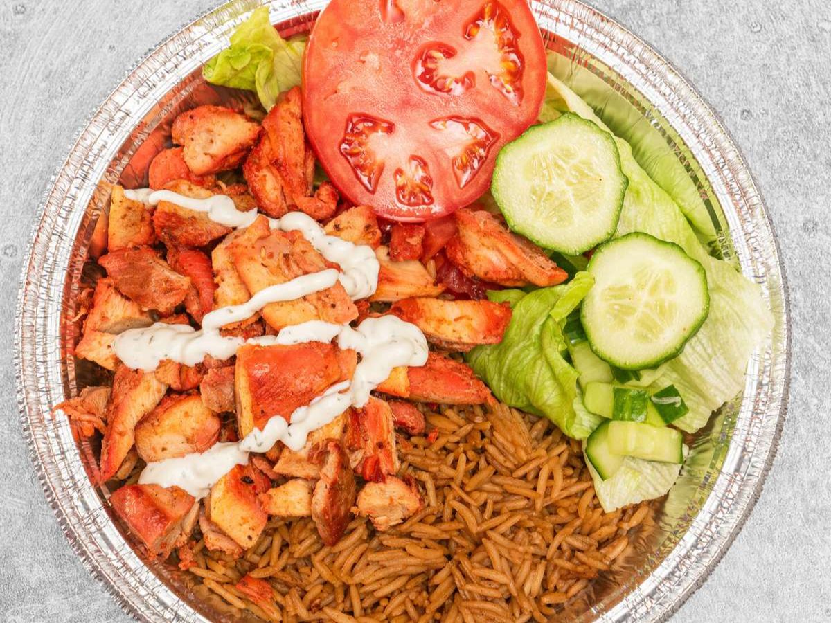 Grilled chicken served over fragrant basmati rice with a lettuce tomato cucumber salad. Customize your dish with your choice of white sauce, hot sauce, BBQ sauce, or no white sauce. Add extra chicken for more protein.