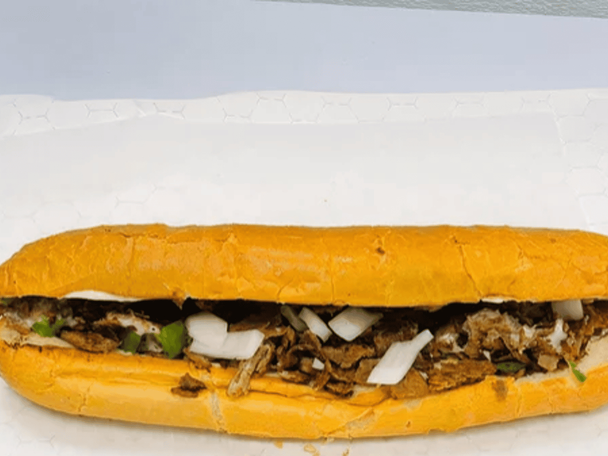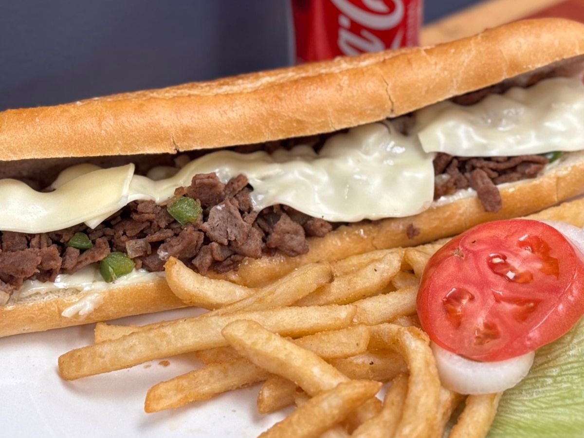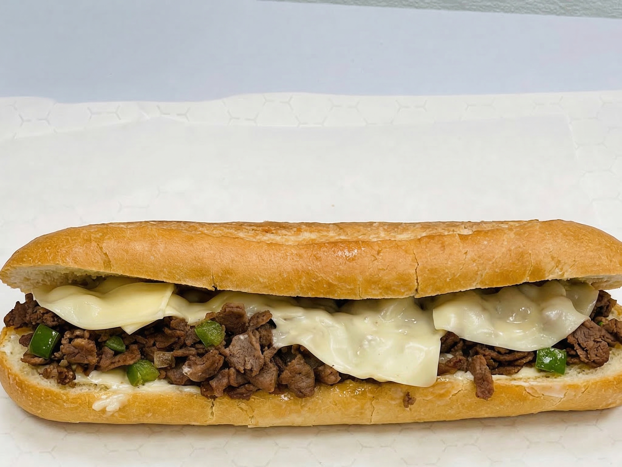 Tender slices of ribeye steak topped with melted cheese, sautéed onions, and peppers on a toasted hoagie bun. Juicy, flavorful, and satisfying.
