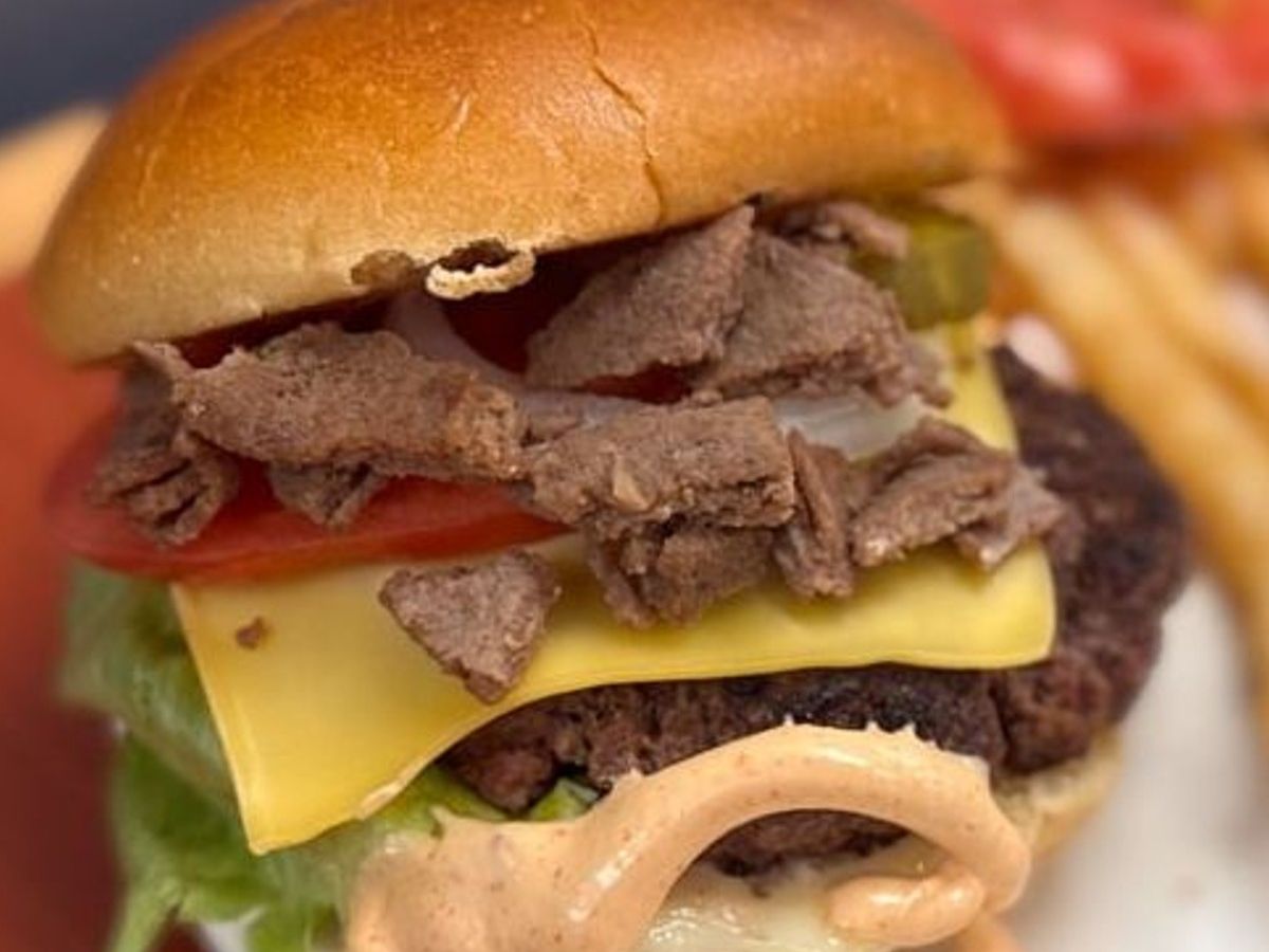 Kebabish sauce, beef patty, cheese, pickles, onions, jalapeño, tomato, lettuce, and Halal steak.