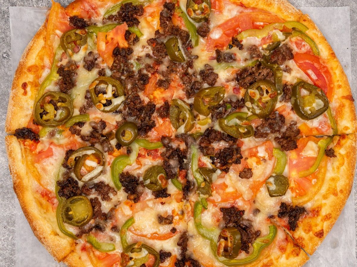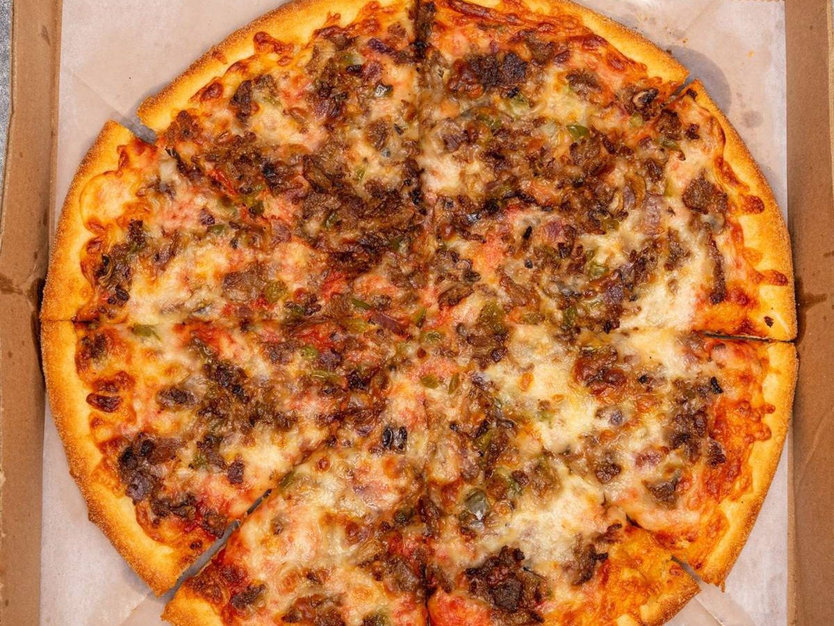 Tender steak slices, green peppers, onions, mushrooms, and melted cheese on a classic pizza base.