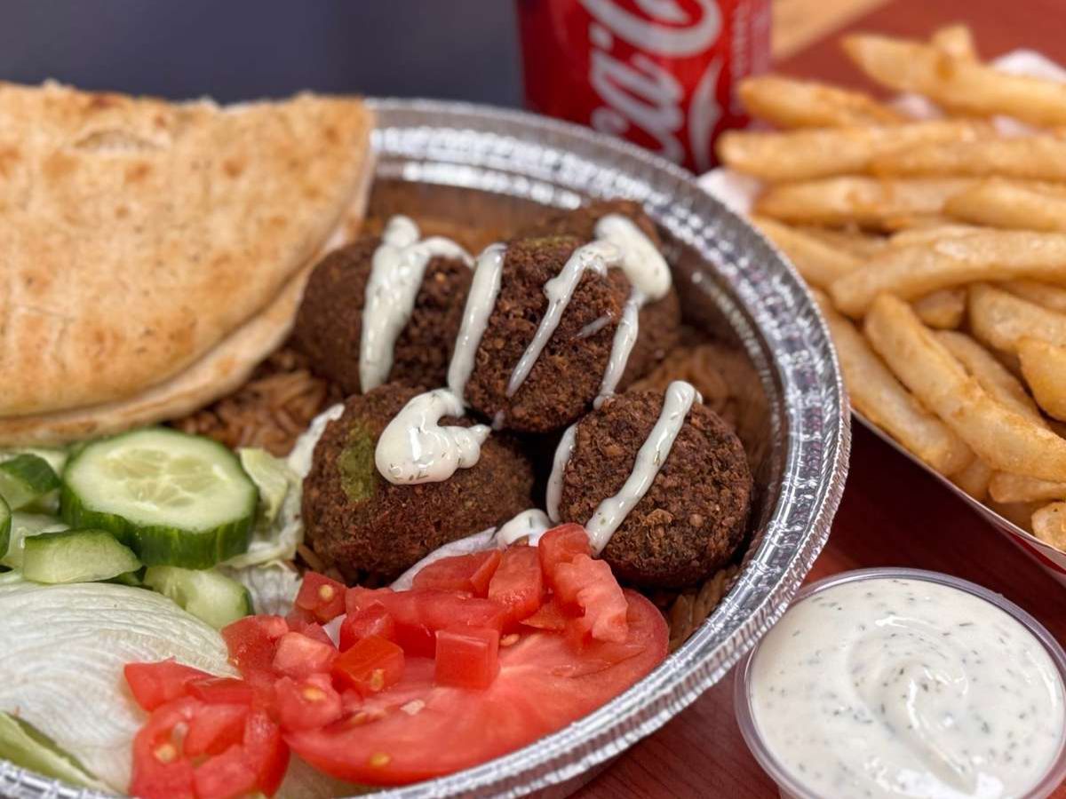 Falafel over brown basmati rice with lettuce, tomato, cucumber salad, and a choice of mild white, spicy hot, or BBQ sauce. Comes with fries and a drink.
