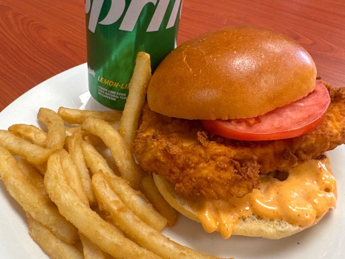 Crispy chicken sandwich with tomato, fries, and a choice of drink.