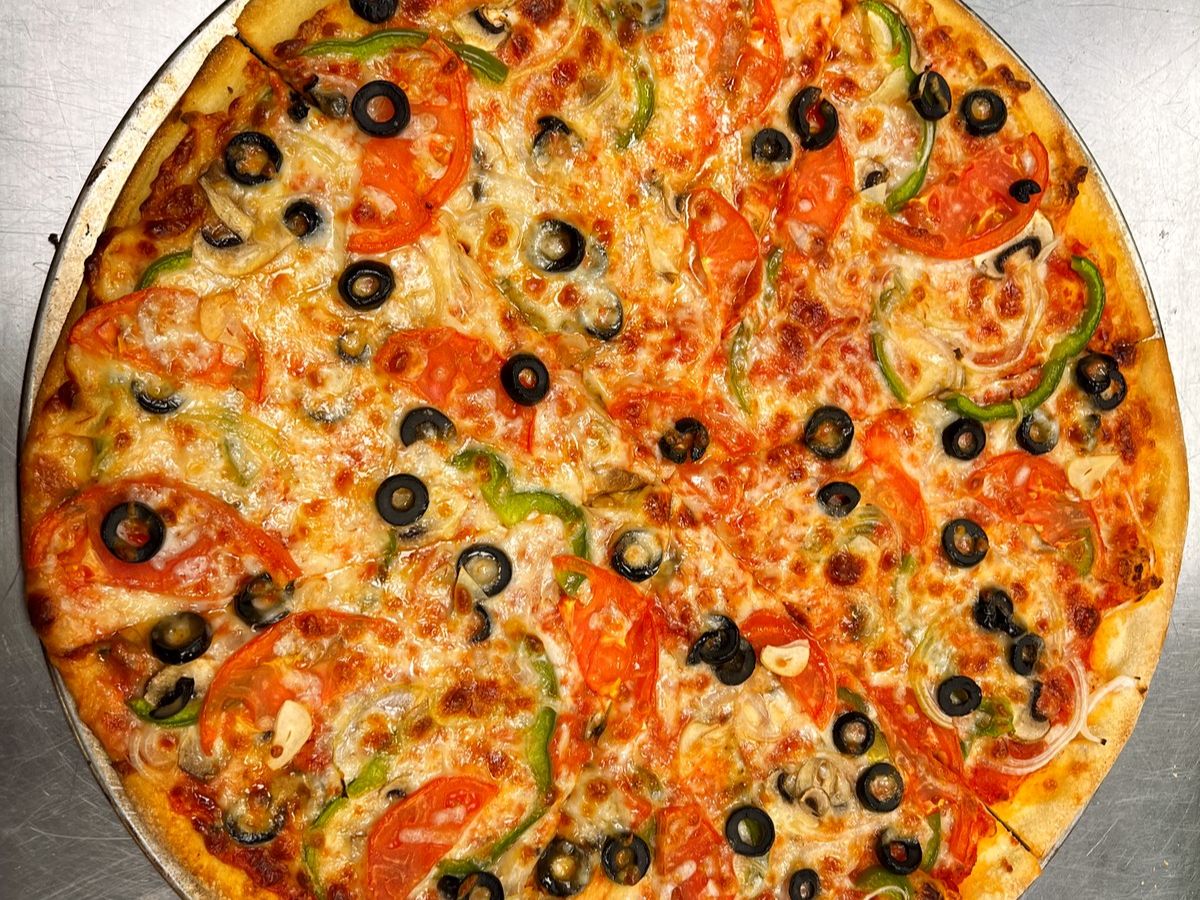 A vibrant mix of bell peppers, onions, tomatoes, mushrooms, and black olives, topped with melted mozzarella cheese.