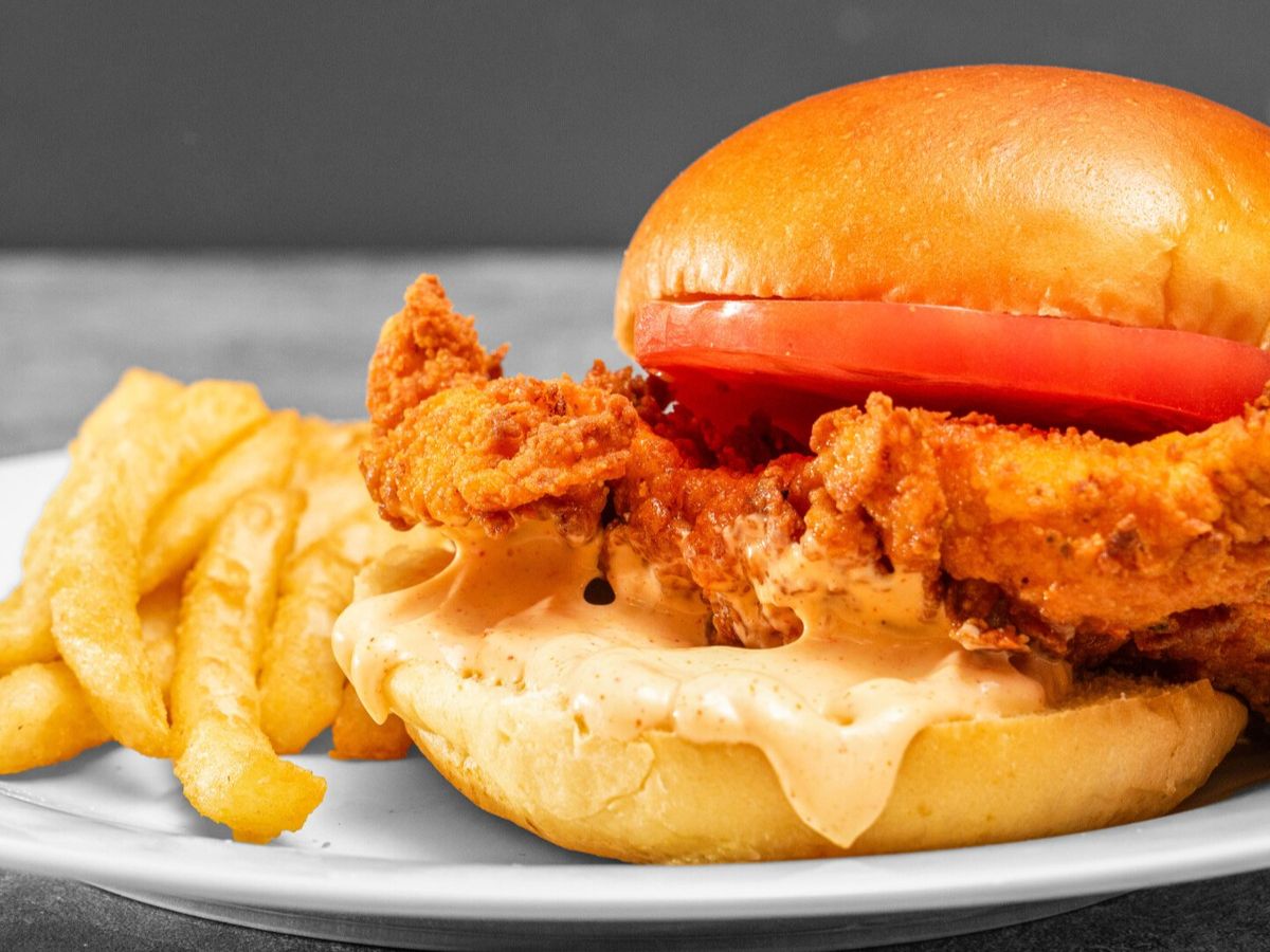 Juicy fried chicken breast, crisp lettuce, and creamy sauce on a sesame seed bun.