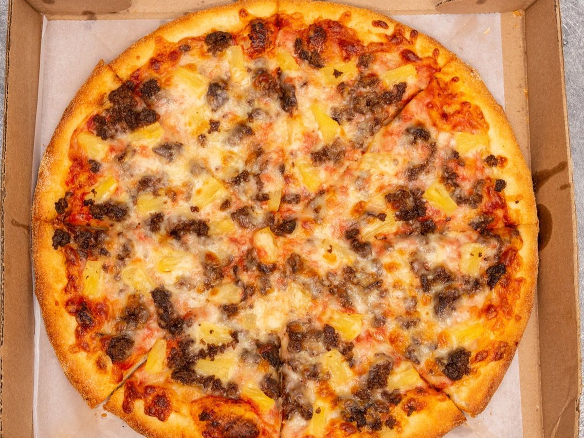 Hamburger, pineapple, and mozzarella cheese on a tomato sauce base.